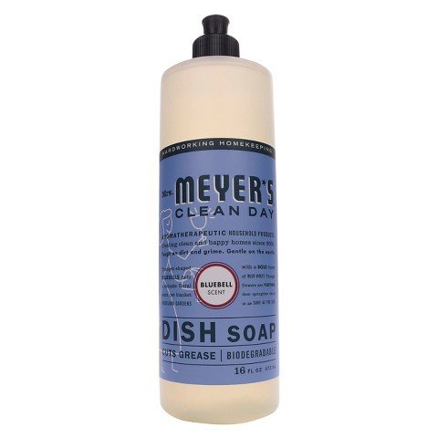 Product Description Mrs. Meyer's Bluebell Dish Soap 16 oz Style and color assortment may vary Product Results: Dissolves Food, Removes Grease, Eliminates Odors, Cleaner Product Form: Liquid Recommended Product Application: Dishes Recommended Cleaning Surface: Multi-surface, Glass Scent: Floral Product Warning: keep out of reach of children Capacity (volume): 16.000 0