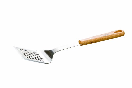 -. Feature : Stainless steel utensil with wooden handle / Wide head is slotted with beveled edges / Easily slide under food to pick up / Measures 18-inch long / Leather hanging strap
