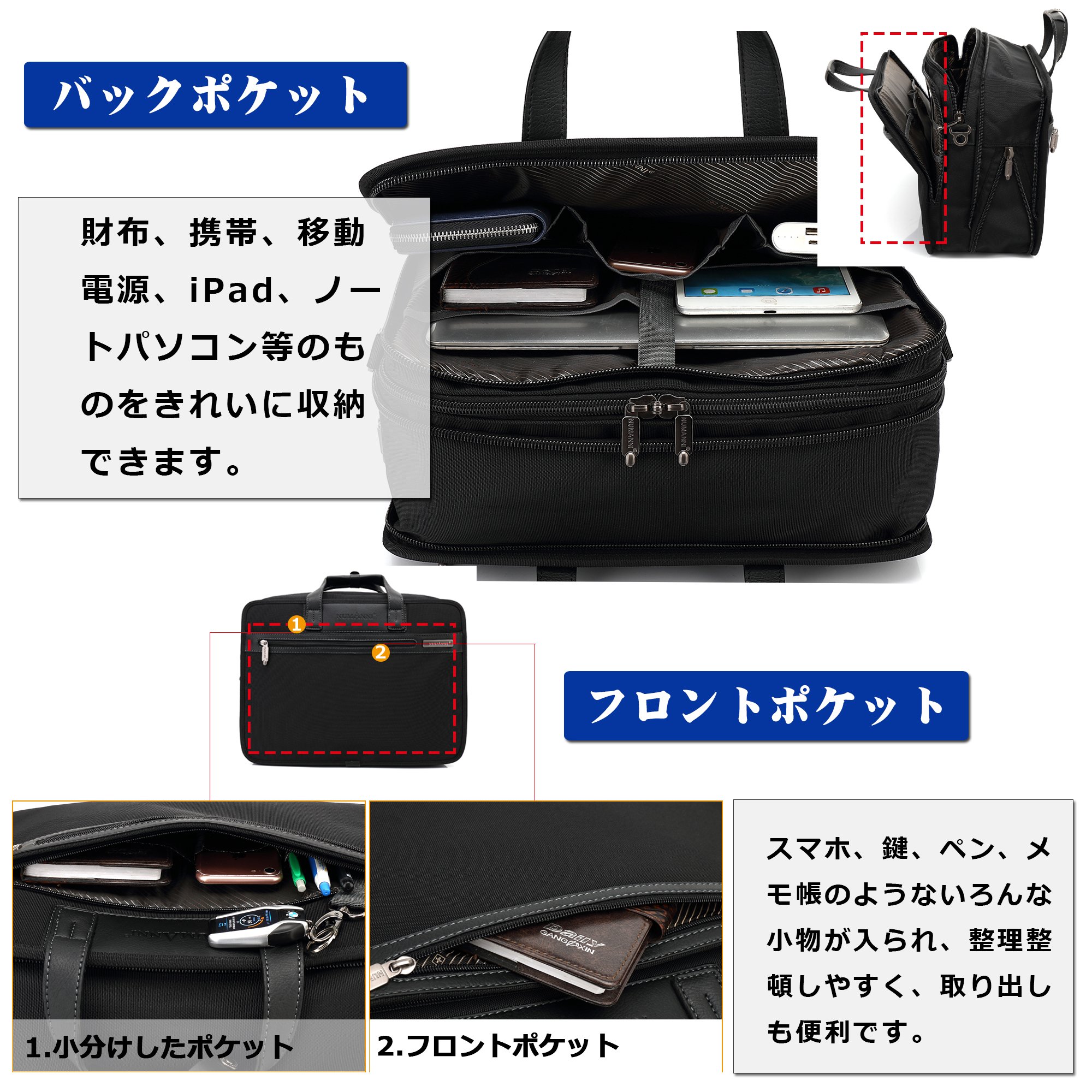 * [Front pocket]: Subdivided pocket * 1 (pen holder * 3, accessory case * 2, key holder * 1), fastener pocket * 1