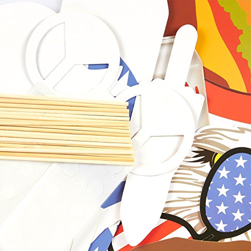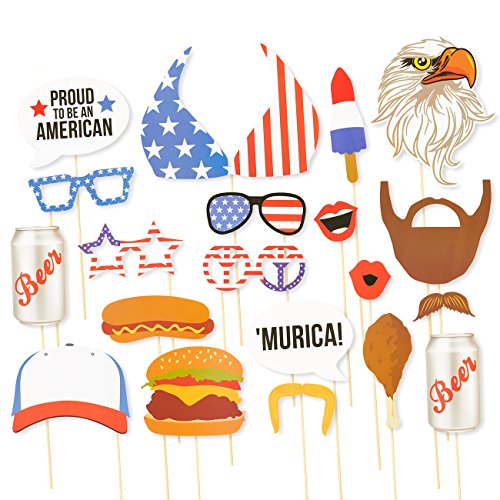Studio : Juvale Publisher : Juvale Binding : Toy Product Description Give your 4th of July an extra dose of fun, this year, with this 24 Piece Set of Novelty Patriotic Party Props. This 20-piece set of all-American party and photo booth props includes 2 hamburger props, 1 eagle, 2 beer cans, 1 trucker hat, 1 star-spangled bikini, 4 pairs of sunglasses props, 1 "MURICA!" speech bubble, 2 mustaches, 2 red lips, 1 "PROUD TO BE AN AMERICAN" speech bubble, 1 fried chicken drumstick, 1 beard and 1 popsicle. Perfect for any American themed party, Labor Day celebration, Veteran's Day events and annual 4th of July parties. These props are made of 355 gsm paper card stock. Ideal as novelty photo booth decorations for use with friends for your social media profile, personal scrapbook or photos for nostalgia in years to come. 0