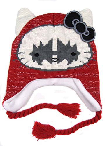 Older girls Hello Kitty Peruvian hats . Four styles to choose from . The hats come with funky kitty ears with a 3D bow attached to the hat . A silver glitter thread gives the hat a all over glittery sparkle . Fleece lined for extra warmth . Available in grey , red , black or white .All hats have a twisted braid with tassle ends .One size but would suit 8 Years plus .100% Acrylic Outer 100% Polyester InnerFeature