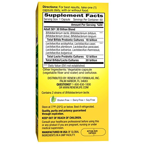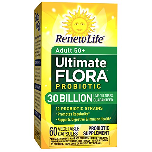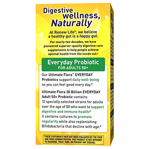 ReleaseDate : 2013-07-19 Studio : Renew Life Publisher : Renew Life Binding : Health and Beauty Product Description Ultimate Flora Adult 50 Probiotic 30 Billion is a high-potency formula with 6 scientifically studied strains for adults over the age of 50. This daily probiotic supports digestive and immune balance so you can feel better, lighter, and more energized. It contains more cultures to promote regularity while also replenishing Bifidobacteria that decline with age. These statements have not been evaluated by the Food and Drug Administration. This product is not intended to diagnose, treat, cure, or prevent any disease. * These statements have not been evaluated by the Food and Drug Administration. This product is not intended to diagnose, treat, cure, or prevent any disease. 0