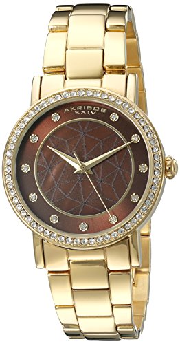 -. Binding : Watch -. Brand : Akribos XXIV -. Color : Gold/Yellow/Brown/MOP/Mother-of-Pearl -. Department : womens -. EAN : 0848572072595 -. Feature : Radiant brown sunburst dial border with die cut center cutout and genuine brown mother of pearl inset featuring three hand movement / Crystal hour markers with dauphine style gold tone hour and minute hands / Polished yellow gold ion plated alloy case with genuine crystal bezel and polished gold tone stainless steel bracelet / Quartz movement with analog display / Water-resistant to 30 M (100 feet) -. Label : TWI Watches, LLC -. Manufacturer : TWI Watches, LLC -. Model : AK880YGBR -. MPN : AK880YGBR -. PartNumber : AK880YGBR -. ProductGroup : Watch -. ProductTypeName : WATCH -. Publisher : TWI Watches, LLC -. Studio : TWI Watches, LLC -. Title : Akribos XXIV Women's AK880YGBR Round Brown Dial Three Hand Quartz Bracelet Watch -. UPC : 848572072595