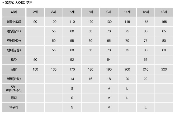 * 사 이 즈 : 100, 110, 120, 130, 145, 155
