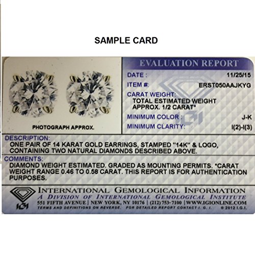 -. Binding : Jewelry -. Brand : Amanda Rose Collection -. Department : womens -. Feature : IGI Certificate and Box included. / 14K Yellow Gold Settings and Screw Backs / 1/2ct Total Diamond Weight. / All of our diamond suppliers and MLG state that to the best or their/our knowledge that all of our diamonds are conflict free. -. Label : Amanda Rose Collection -. Manufacturer : Amanda Rose Collection -. Model : PDE50YGBASKZIGIQ1 -. MPN : PDE50YGBASKZIGIQ1 -. PackageQuantity : 1 -. PartNumber : PDE50YGBASKZIGIQ1 -. ProductGroup : Jewelry -. ProductTypeName : FINEEARRING -. Publisher : Amanda Rose Collection -. Studio : Amanda Rose Collection -. Title : 1/2ct tw IGI Certified Diamond Stud Earrings in 14K Yellow Gold with IGI Gift Box