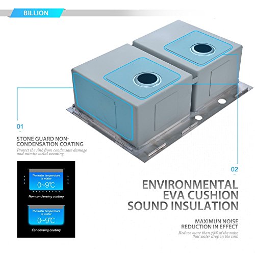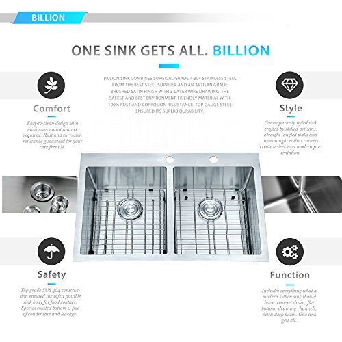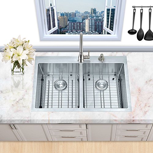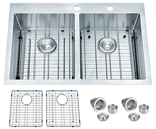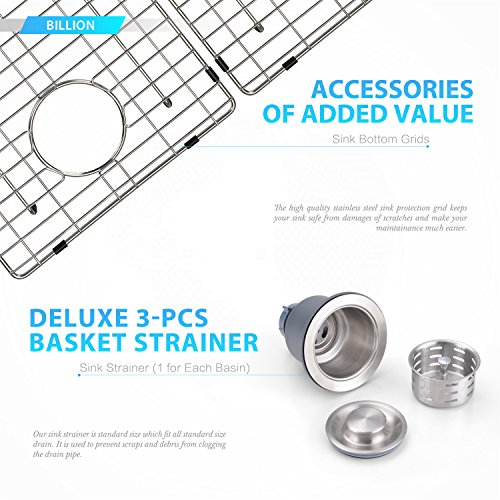 FREE accessories: 2 deluxe 3-1/2" drains, 2 sets of 3pc basket strainer, a set of 50/50 scratch-prevention stainless steel bottom grid; Comes with mounting hardware, template & manual for easy installation.