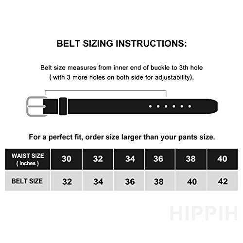 Black1: Size 34 (Waist 32)Belt total length:105cm/41.3' From the buckle to the first hole and last hole 32'-37' Size 36 (Waist 34)Belt total length:110cm/43.3' From the buckle to the first hole and last hole 34'-39' Size 38 (Waist 36)Belt total length: 115cm/45.3' From the buckle to the first hole and last hole 36' - 41'