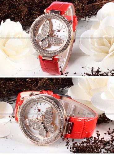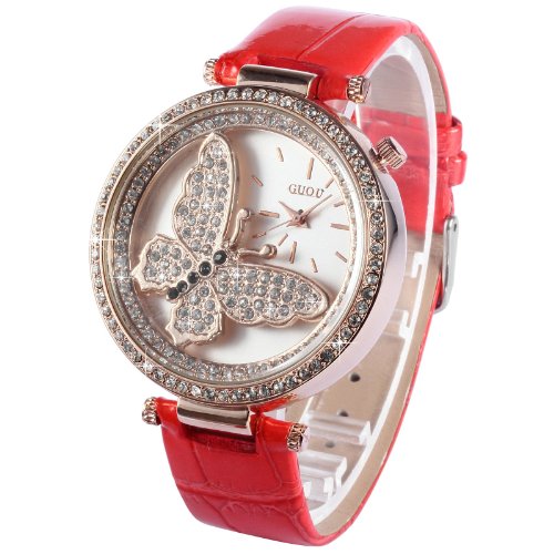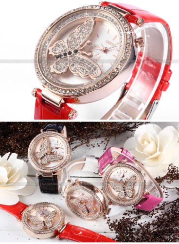 Fashion Lady Women Dress Butterfly Crystal Red Leather Bracelet Quartz Watch WK1097