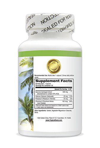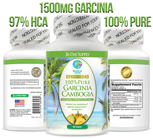 -. Binding : Health and Beauty -. Brand : Tropical Oasis -. EAN : 0788454267445 -. Feature : MAXIMUM STRENGTH 97% HCA Extract! HIGHEST AVAILABLE! - No other Garcinia formula has 97% HCA extract so don't be fooled by false advertising! --HCA blocks fat by inhibiting a key enzyme (Citrate lyase) that your body needs to make fat from carbohydrates* / MOST POTENT FORMULA AVAILABLE ANYWHERE -With 1500mg of 100% Pure Garcinia Cambogia. / NATURAL APPETITE SUPPRESSANT* - HCA suppresses appetite by increasing serotonin levels. By increasing serotonin levels, HCA improves mood and suppresses the drive to react to stressful situations with food.* / NATURAL ENERGY: HCA helps your body convert carbs to energy instead of fat! / LOSE WEIGHT OR YOUR MONEY BACK! We know we have the best Garcinia Formula available and stand behind our product! If it doesn't work for you simply return it for a FULL REFUND! -. IsAdultProduct : 0 -. Label : Tropical Oasis -. Manufacturer : Tropical Oasis -. MPN : 788454267445 -. PackageQuantity : 1 -. PartNumber : 788454267445 -. ProductGroup : Health and Beauty -. ProductTypeName : HEALTH_PERSONAL_CARE -. Publisher : Tropical Oasis -. Studio : Tropical Oasis -. Title : 97% HCA Garcinia Cambogia - Maximum Strength 1500mg of 100% Pure Garcinia Cambogia Extract - Natural Weight Loss Supplement, Appetite Suppressant, & Fat Blocker* - 90ct -. UPC : 788454267445