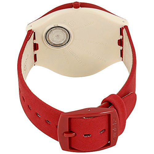 Swatch Skin Skinhot Beige Dial Leather Strap Unisex Watch SVUR100. 40 mm red plastic case with a beige dial, a plastic crystal, red luminescent hands, and white railroad track as hour markers. Printed logo beneath the 12 o'clock position. Hands: hours and minutes. Case thickness of 6 mm. Push / pull crown. 17 mm red leather strap with a plastic buckle clasp. Quartz movement and water resistant up to 30 meters. Skin series.Feature