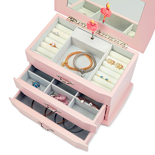 STUNNING DESIGN - Charming girls musical jewelry box carefully designed with hourglass curvature and elegant silver hardware finish. The perfect gift for your princess of any age.