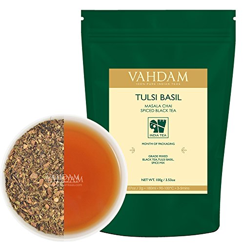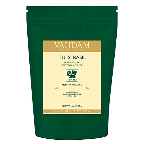Organic Tulsi Basil Masala Chai Tea Leaves from India (50 Cups), Unique Blend of Assam Black Tea, Tulsi Holy Basil, Cinnamon, Cardamom, Ginger, Black...
