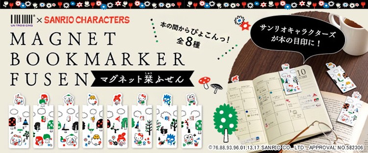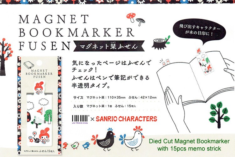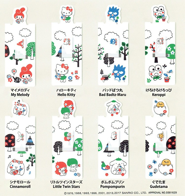 サンリオの人気キャラクターが、ふせんのついた栞になりました。 キャラがチョコンとのぞいて目印に。 カチッとマグネットではさめるので、本を開いていても落ちません。 気になったページはふせんでチェック。ふせんにもサンリオキャラがワンポイントでデザインされています。 ふせんは、ペンで記入できる半透明フィルムタイプ。