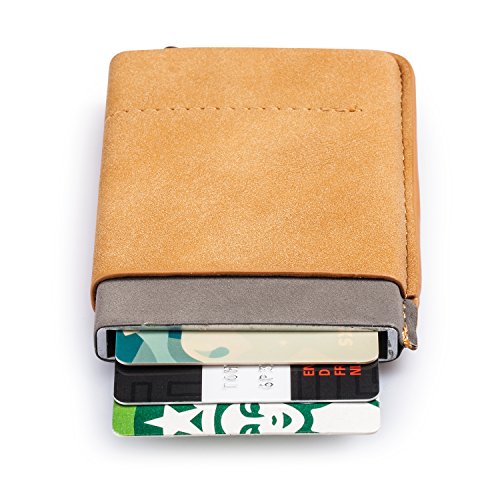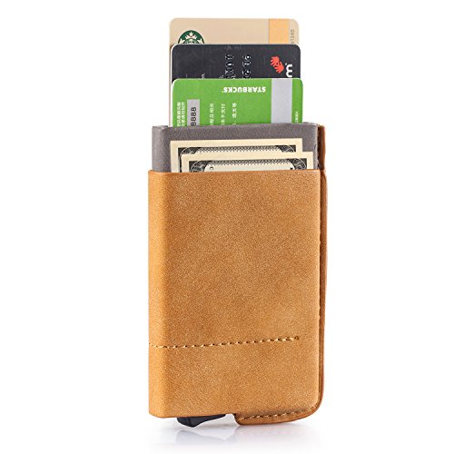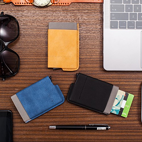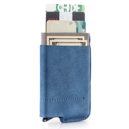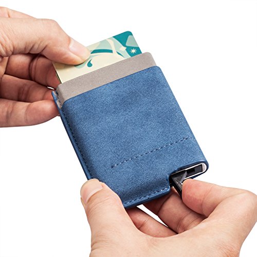 Product Description RFID Blocking Wallet Case for Women or Men, Theft Proof Credit Card Holder with Extra Layers of Security, Slim Design Fits in Front Pocket, Holds 6 Cards that slide out with a spring loaded click and side pockets to hold bills. 0