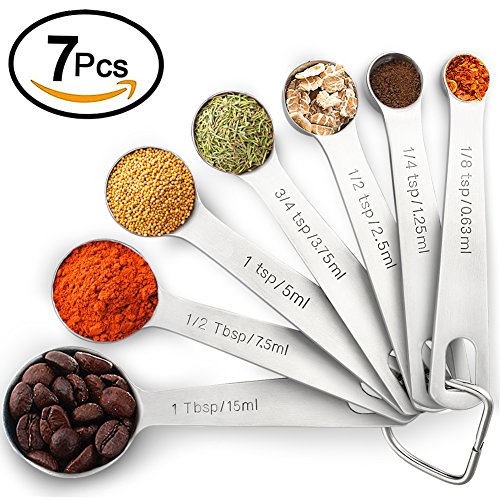 1Easylife All in One Set of 7, 304 Stainless Steel Engraved Measuring Spoons with Stainless Ring Holder, Including 3/4, 1/2 and 1/8 tsp for Measuring Dry and Liquid Ingredients