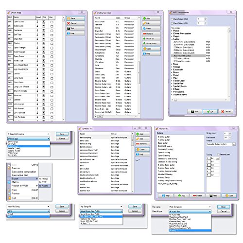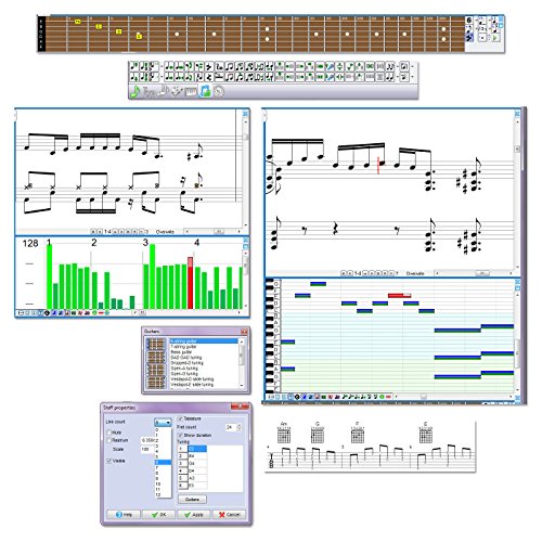 Support for tablature, standard notation, or both in one composition. Create tabs for guitar in standard, drop, and open tunings), bass, banjo, and ukulele plus custom instruments and tunings