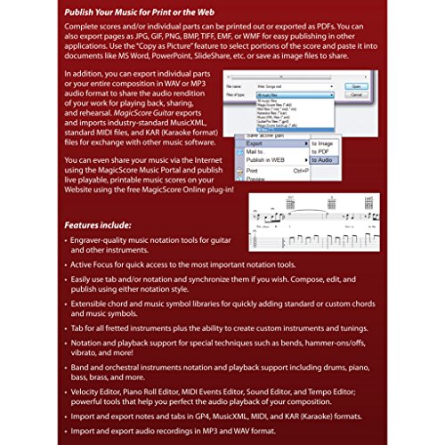 Export as PDF, JPG, or PNG for printing or to use in websites or other software; MP3 or WAV files so others can hear your work; and MIDI, , or KAR for exchange with other applications