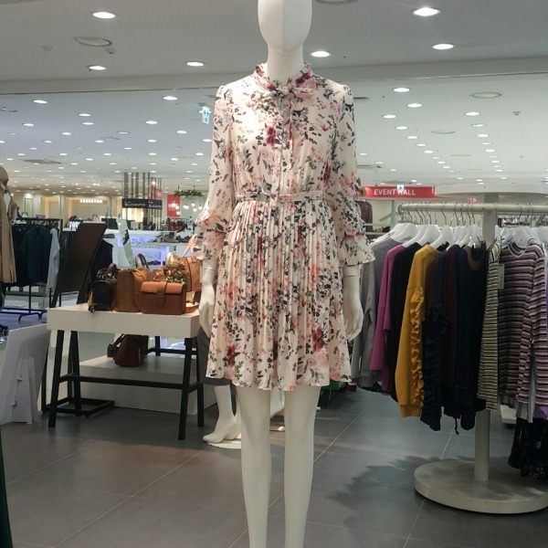 화사한 핑크프린트에 스커트라인에 주름이 포인트되는 원피스입니다