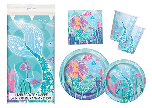-. Feature : Complete set for girls mermaid birthday or sleepover party - serves 16 and includes:. / 16 mermaid dinner plates, 16 mermaid cake plates, 16 mermaid cups, 16 mermaid napkins. / (1) mermaid plastic tablecloth. / Color scheme features aqua/teal, pink and purple.