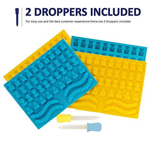 Non-Stick Gummy Bear Mold Bpa Free Silicone (Yellow, Blue) - Set of 4 for 172 Candies - 5 Different Types of Animals – Dropper Included – Candy Molds, Gummy Worm Mold, Gelatin Molds