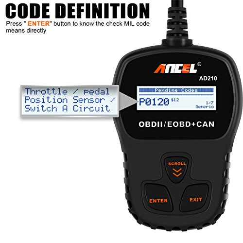 - Ancel AD210 code reader is well built with a high brightness LCD display (128 x 32 pixel) that has white backlight and contrast adjustment, indicates test results. It already has the database for the descriptions and not just the codes, saves your time from looking the codes up on the internet or from manuals. Two Years Warranty Guarantee.