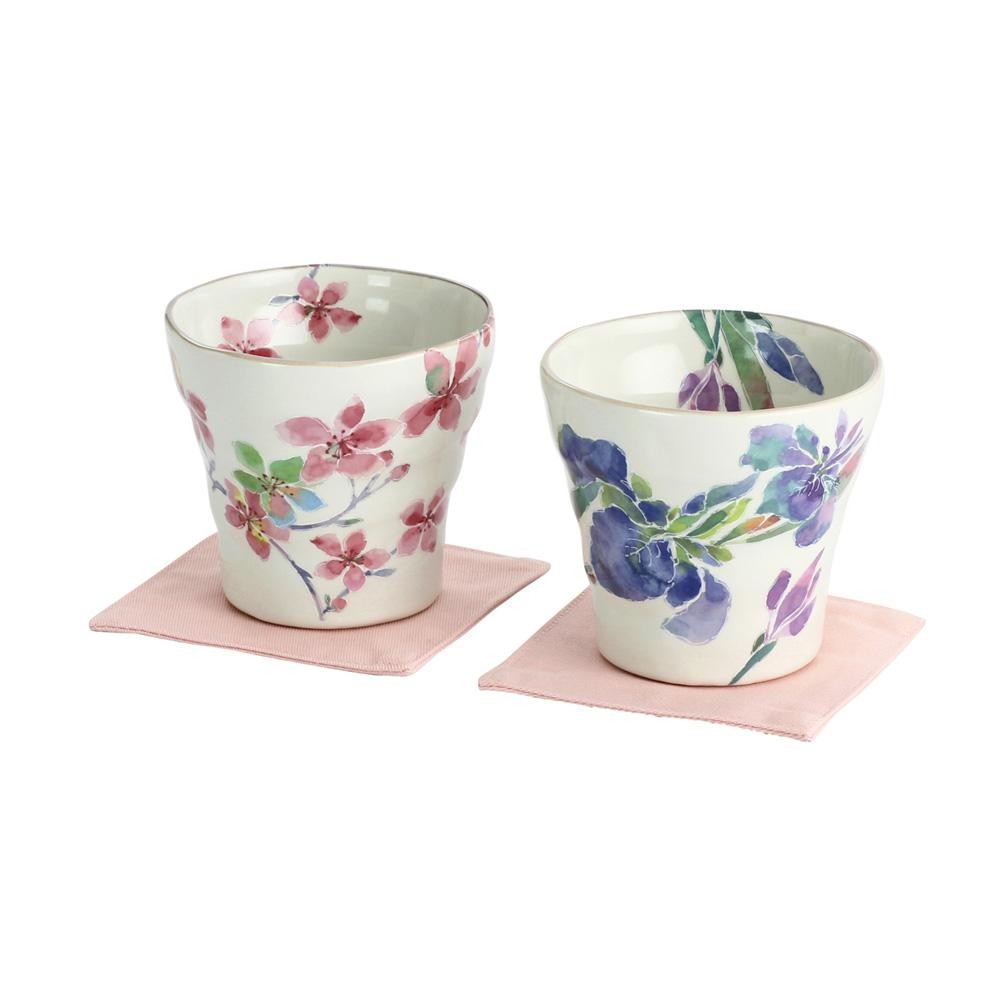 | 桜・アヤメ柄のロックカップとコースターのペアセットです。大切な方へのギフトにも最適です。 |