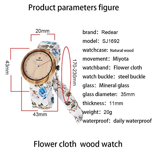 -. Feature : SUPER LIGHTWEIGHT WOOD WATCH: Lightweight(Only 0.04lb) and comfortable on the wrist. Makes you feel like there is nothing on your wrist. It is not encumbering at all. / BAND ADJUSTABLE: Flower cloth strap, very comfortable, fashionable and charming. With a other colors cloth strap, can be chosen as your own needs, adjustable to fit most any wrist. / KEET TIME WELL: Imported Japanese quartz movement, which offers long-lasting usage for up to 12 - 24 months. The quartz crystal oscillates at a consistent rate and requires no winding whatsoever, which guarantee's accurate readings every time. / WATER RESISTANT: Casual and stylish watch that goes with many styles of clothing, but not to be placed in or around water, not to be for showering and swimming, only for washing hands and raindrops. / GREAT GIFT & WARRANTY: Our wooden watch is carefully prepared, packaged and delivered to you in our gift box, the casual wood wrist watch is a quite special gift idea for someone special (such as lovers, friends, parents...) 【Ideashop provide 12-Month Worry-Free Warranty and Unconditional 45-Day Refund & Free Lifetime Technical Support. 】
