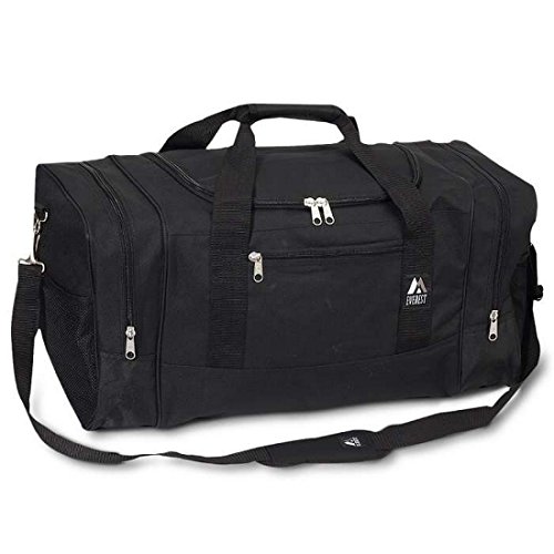 Product Description Keep your travel essentials stylishly stowed in the Everest ?Standard Duffel Bag. This lightweight and durable polyester duffel bag boasts a spacious main compartment with an easy-access u-shaped opening and plenty of room for your folded clothing. Zippered end pockets are perfect for storing shoes and soiled laundry; or for quick access to frequently-needed items, and a zippered front pocket keeps valuables or travel documents safe and secure. The Standard Duffel Bag has a padded, adjustable shoulder strap and double top handles for carrying comfort and versatility. 0
