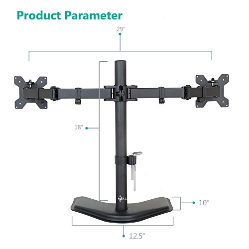 -. Binding : Wireless Phone Accessory -. Brand : WALI -. Color : Black -. EAN : 0811278020412 -. Feature : Compatibility: Fits Most Monitors, LCD, Plasma, Panel TV and Flat Screen up to 27 inches. The plates are detachable and height adjustable. The Free Standing V-Base can stably fit any desk and optional Grommet-Base compatible with the desk thickness up to 4 inches / Double Benefits: Double efficiency and productivity to make working or relaxing that much more comfortable. Open up available desk space can help to provide a new range of adaptable positions for your displays / Sturdy Construction: The high grade material ensures a strong and stable connection with your monitor screen. The elegant engineering keeps your work space looking modern and sleek. Hardware and an easy to follow instruction guide are included within the box. / Dynamic: Our monitor arm is easily adjustable, allowing you to work in a more comfortable, ergonomically correct position to reduce neck and eye strain. The contemporary design will surely assimilate into nearly any environment, it is ideal for homes, dorms, schools, businesses, offices, IT networks, manufacturing plants, etc / Multiple Adjustments: Arms extend and retract, tilt to change reading angles, and rotate from landscape-to-portrait mode. Easy to install and sets up in minutes. Kit includes the mount, hardware kit and installation instructions." -. Label : WALI -. Manufacturer : WALI -. Model : MF002 -. MPN : MF002 -. NumberOfItems : 1 -. PackageQuantity : 1 -. PartNumber : MF002 -. ProductGroup : Personal Computer -. ProductTypeName : COMPUTER_ADD_ON -. Publisher : WALI -. Studio : WALI -. Title : WALI Dual LCD Monitor Mount Free Standing Fully Adjustable Desk Fits Two Screens up to 27", Full Motion, Tilt, Swivel, Rotate, 22 lbs Capacity, With Optional Grommet Base (WL-MF002) -. UPC : 811278020412