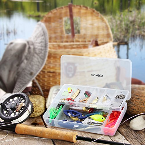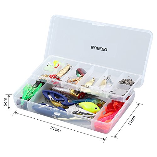 -. Feature : 106 PCS ITEMS: Enkeeo fishing tackle set contains 106 pieces of different types of lures: hard, soft, and metal baits, topwater fishing lures, scissors and other accessories / WIDE RANGE OF USE: perfect for any anglers from beginners to veterans; suitable for both freshwater/saltwater, offshore fishing, rock fishing, lake, pool, river and more / EASY TO TAKE AROUND: everything organized neatly in a portable tackle box, easy to find anything you need and to take around; lightweight, waterproof and dampproof / LIFELIKE LURES & BAITS: vivid colors make these baits lifelike; a perfect imitation of worms, shrimps, squids, small fishes and more, effectively tricks fishes of a great range of species to bite the hook / MADE TO LAST: everything you need to fish for a very long time; artificial baits made of environmentally friendly plastic which is extremely durable; all in a red, reusable box