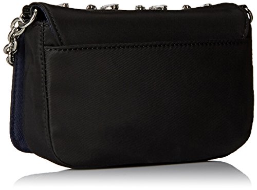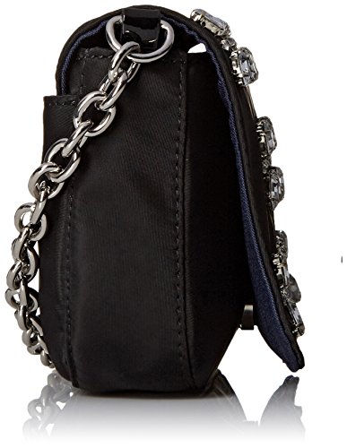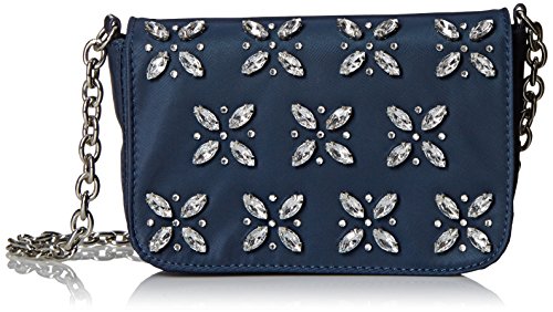 Small bag featuring fold-over flap studded with round and marquise-cut rhinestones