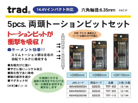 【商品名】 (業務用25セット) TRAD 両頭トーションビットセット/先端工具 【5本組×25セット】 +2x65mm TRT-655 〔DIY用品/大工道具〕 【ジャンル・特徴】 欠け・サビに強い!木材・アルミ・鉄板等ハードな締付作業に。 ■サイズ・色違い・関連商品■+2x110mm 2セット■+2x110mm 10セット■+2x85mm 3セット■+2x85mm 15セット■+2x65mm 5セット■+2x65mm 25セット[当ページ] ■商品内容 【ご注意事項】・この商品は下記内容×25セットでお届けします。木材・アルミ・鉄板などハードな締め付け作業に。■商品スペック●材質●ビット:S2●●+2x65mm●入数 5本組■送料・配送についての注意事項●本商品の出荷目安は【1 - 7営業日 ※土日・祝除く】となります。●お取り寄せ商品のため、稀にご注文入れ違い等により欠品・遅延となる場合がございます。●本商品は同梱区分【TS1】です。同梱区分が【TS1】と記載されていない他商品と同時に購入された場合、梱包や配送が分かれます。●沖縄、離島および一部地域への配送時に追加送料がかかる