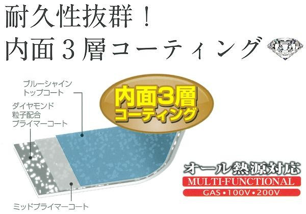 丈夫な特殊加工により、変形に強く金属ヘラも使えます。ダイヤモンドの粒子を配合した強力コーティング「ブルーダイヤモンドコート」。汚れやコゲがこびりつきにくく、お手入れもラクラク!また、少量の油で調理可能なヘルシークッキングを実現しました。オール熱源対応です。 |