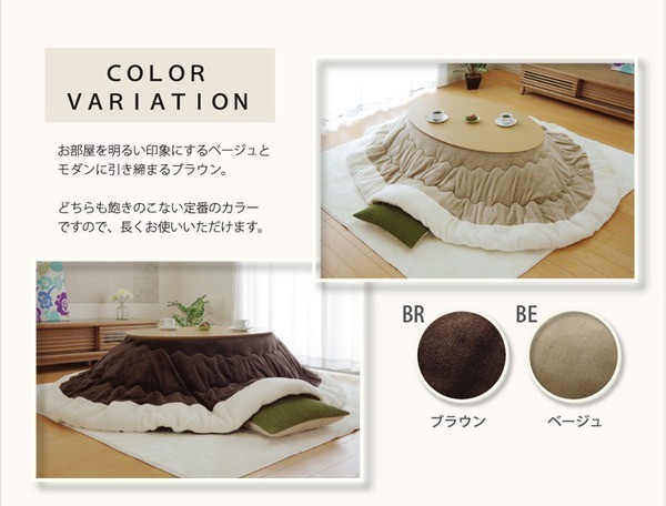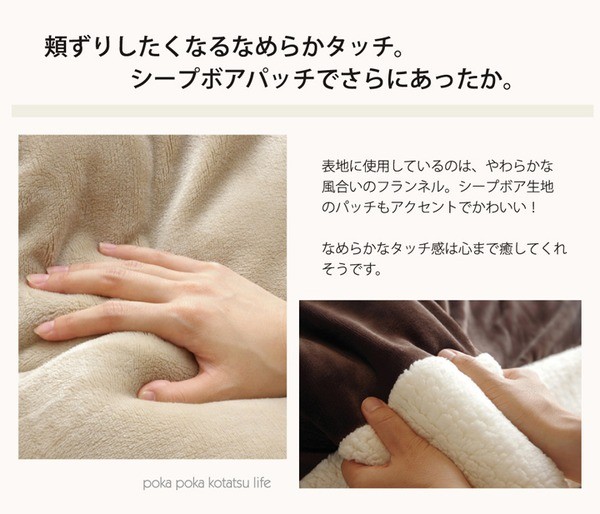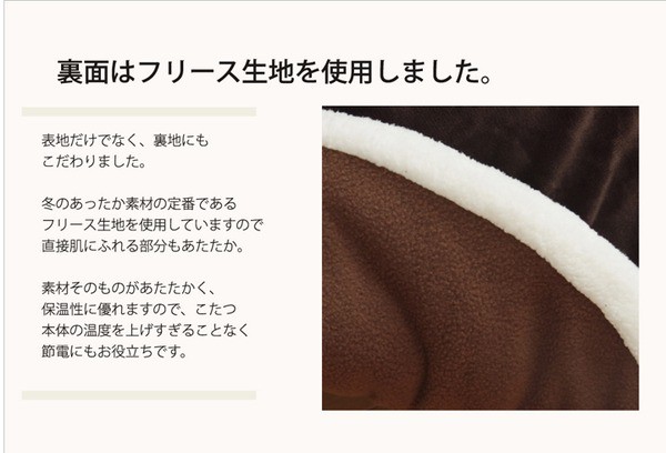 無地のこたつ布団です。表地には柔らかく、肌触りの良いフランネル生地を使用してます。裏地には軽くて保温性の高いフリース生地を使用しています。部分暖房のコタツは電気代もおトクです。また、表地の素材が同じで同色のキルトラグも別途取扱いがありますので、トータルでのコーディネートもおすすめです。