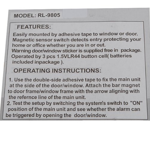 - Feature : Easy to install--just peel and stick / Magnetic sensor switch detects entry protecting your home or office / Operated by 3pcs of. 5VLR44 / AG 13 button cell ( included ) / Size: 6.2cm x 3.2cm x 2cm / 2 pieces