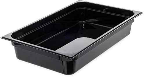 Studio : Carlisle Publisher : Carlisle Binding : Misc. Product Description The Carlisle 10401B03 full size, 4" deep, high heat food pan (-40°F to 375°F) provides a single solution for cold storage, flash-freezing, microwave preheating and cooking as well as prolonged high temperature retention in steam table applications. Use the black 12.7 quart pan to assemble, transport and display finished foods and toppings of all temperatures at events and buffet stations. Molded-in capacity indicators (quarts and liters) display measurement and facilitate portion control. A smooth rounded interior makes every scoop count and reduces food waste. The textured exterior edges resist scratching and offer improved handling. The pan is stackable for convenient storage. It is also compatible with Carlisle StorPlus Universal and Smart Lids (sold separately). It is NSF Listed, BPA Free and dishwasher safe. The food pan has overall measurements of 20.75 x 12.75 x 4 inches (L x W x D). 0