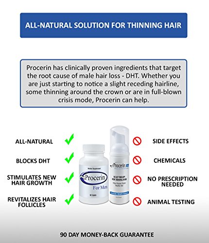 Procerin comes in a convenient tablet form and topical solution that are used daily for the treatment of male hair loss. Procerin is an all-natural supplement available without a prescription. While there are several causes of hair loss, Procerin is effective in reversing hair loss in men caused by androgenetic alopecia, the most common cause of male hair loss. Androgenetic alopecia results in thinning hair and the familiar receding hairline (or widow's peak).