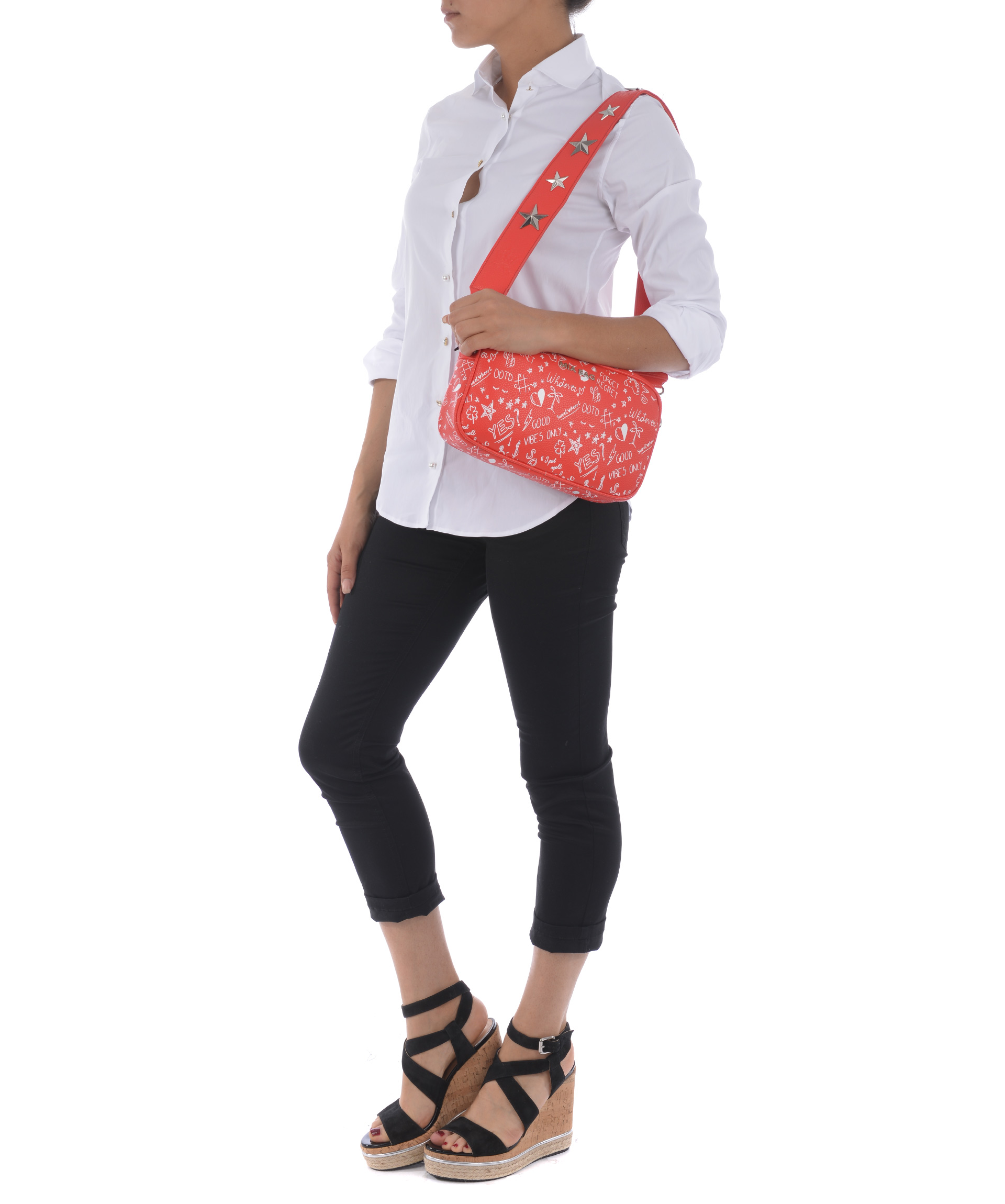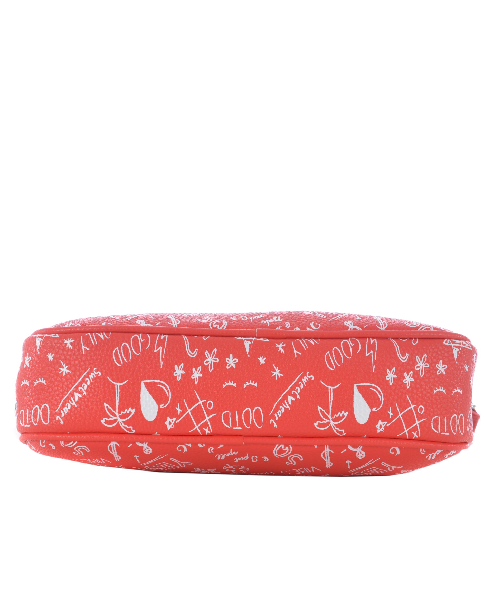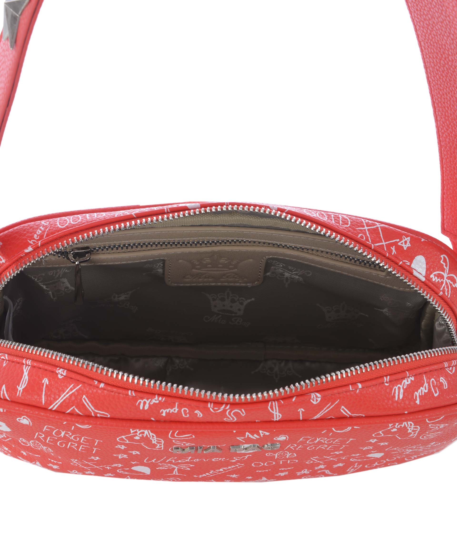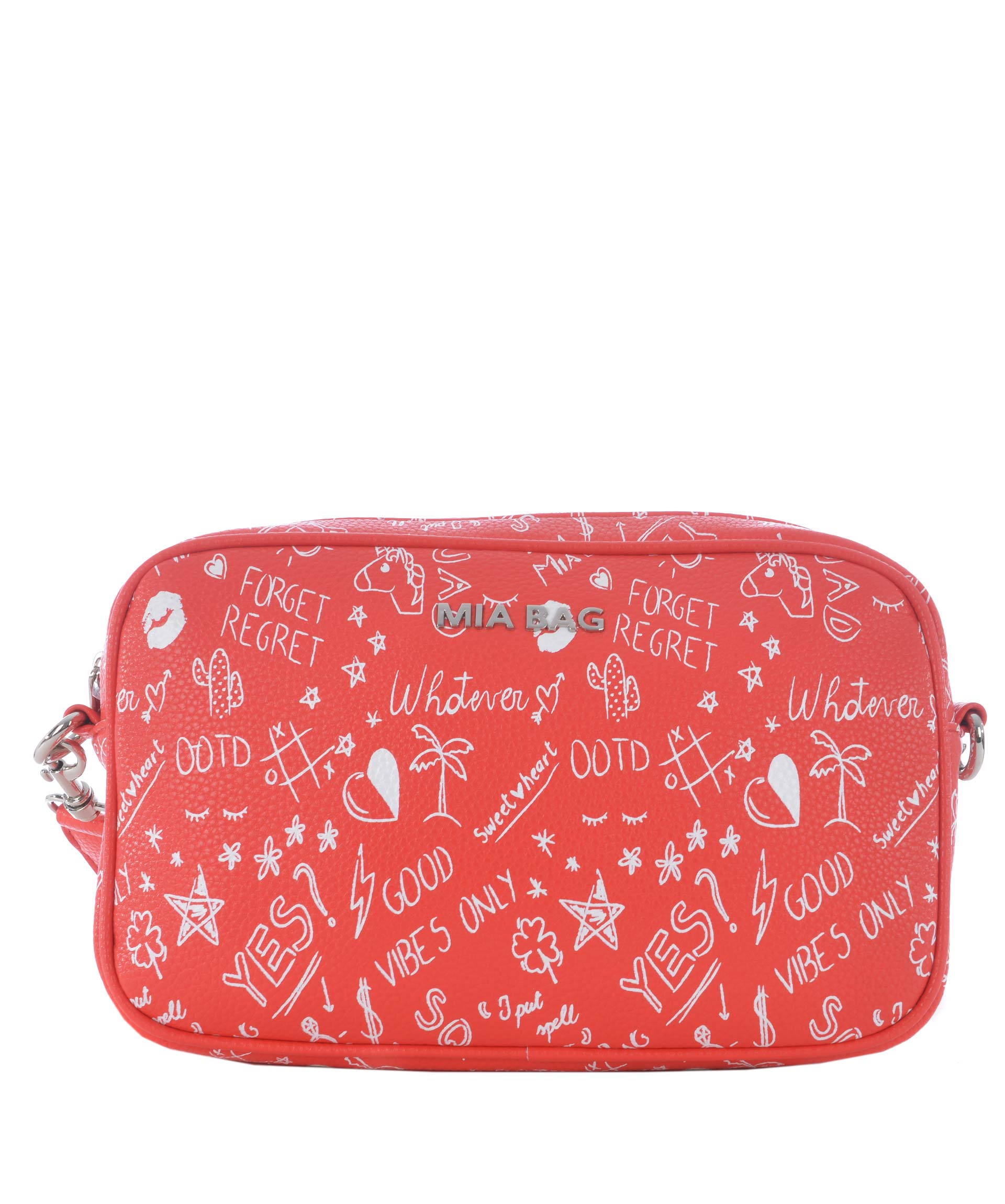 Borsa Mia Bag in ecopelle Rosso. Stampa graffiti su tutta la superficie. Logo frontale in metallo argentato. Manico in ecopelle removibile decorato con stelle in metallo. Chiusura con zip. All'interno tasche applicate, tasca con zip. Fodera logata. Rifiniture in metallo argentato.