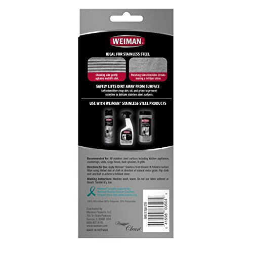 -. Feature : Dual sided: one for cleaning and one for polishing and buffing / Safely lifts dirt away from the surface / Soft microfibers trap dirt, oil and grime to prevent scratches to delicate stainless steel surfaces / Recommended for all stainless steel kitchen appliances, countertops, sinks, range hoods, back splashes, grills and more / Use with Weiman stainless steel aerosols, sprays and Wipes