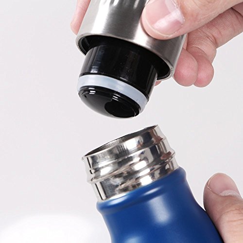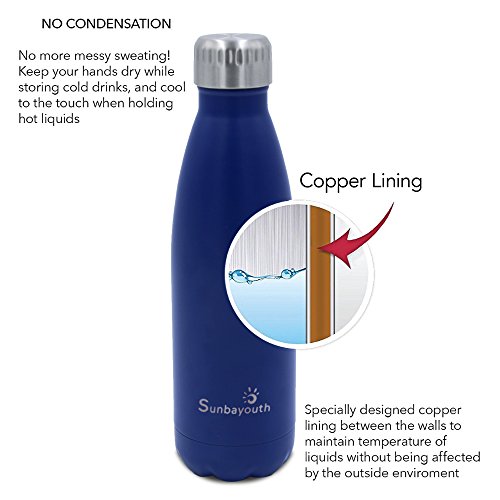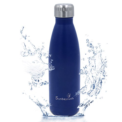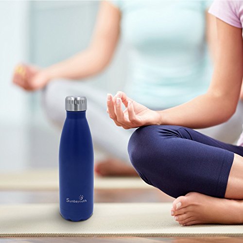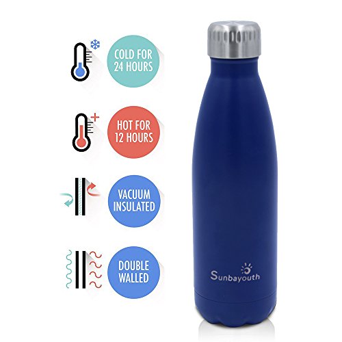 SunbaYouth stainless steel vacuum Water Bottle is perfect design for sport /camping/ hiking/ picnic and so on. While 17 oz (500 ml) capacity is perfect size to fit your daily hydration needs. The double wall sport water bottle comes with a leak proof and Rust proof , which means that you will not worry about leak or rust. High-quality food grade 18/304 stainless steel on both inside and outside walls, scratching resistance, 100% BPA Free for heath-safety. The Unique double walled vacuum insulation technology with vacuum-seal cap keeps your drinks cold for 24hrs and hot for up to 12 hrs. Meanwhile, the Fashion design, beautiful outlook, you will love it yourself and want to gift it to family and your friends. Specifications: Color: dark blue/light blue/black/ gold/