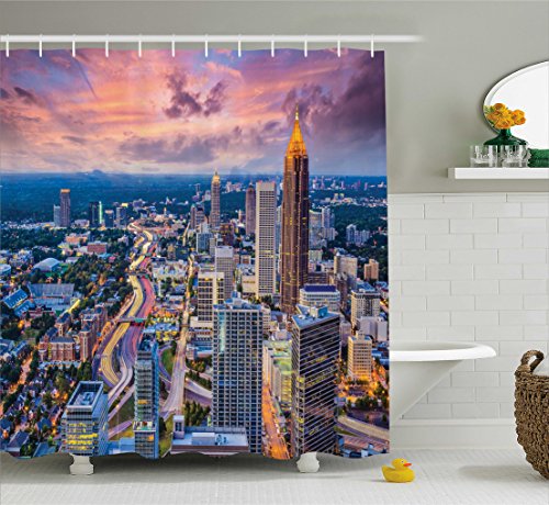 Modern Shower Curtain by Ambesonne, Atlanta City Skyline at Sunset with Hazy Light Georgia Town American View, Fabric Bathroom Decor Set with Hooks, 70 Inches, Baby Pink Blue Silver