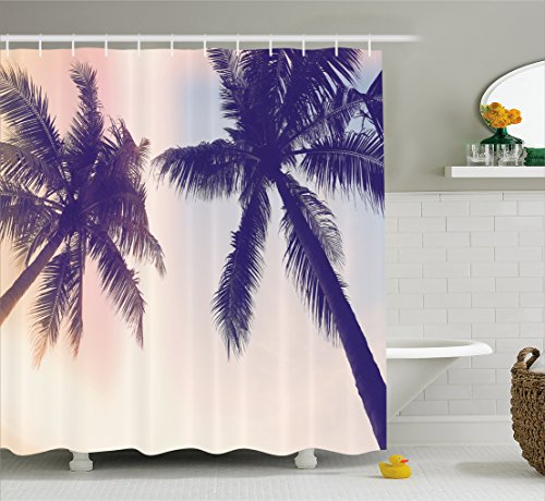 Palm Tree Decor Shower Curtain by Ambesonne, Unusual Toned Trees with Sun Flare Californian Inspirations Art Print, Fabric Bathroom Decor Set with Hooks, 70 Inches, Dark Purple Pink