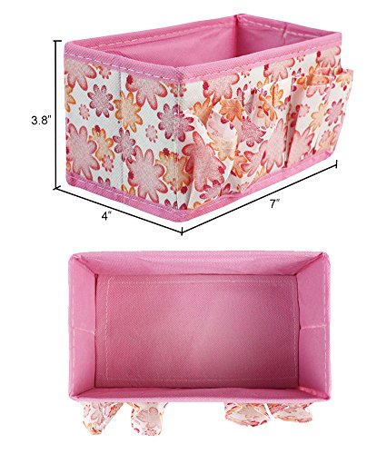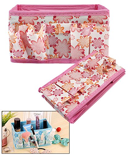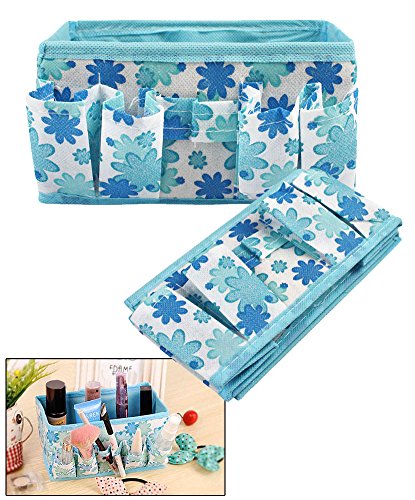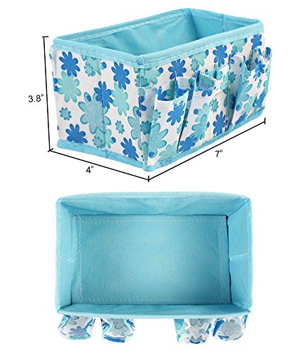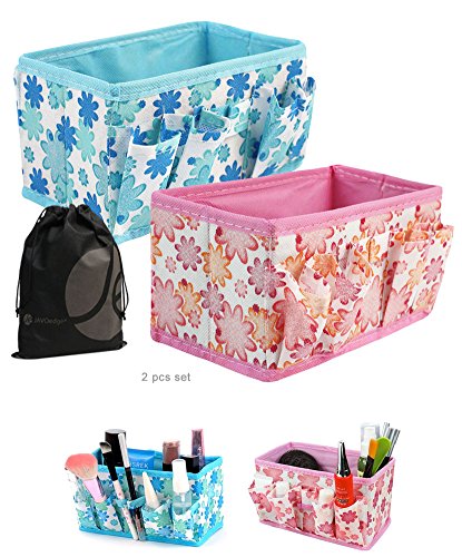 Store and organize small accessories that are cluttering up your bedroom, living room, kitchen, or bathroom in these floral patterned folding cosmetic and toiletry baskets. The 2 pack comes with 2 different colored baskets. The 2 pack comes with 1 pink basket and 1 blue basket. The organizer is great for organizing cosmetics in. The basket folds up when not in use for easy storage. The organizer has pockets on the sides. The basket is great for organizing any small items such as cosmetics, pens, phones, etc. Organize your desktop, bedroom, living room, kitchen, or bathroom in this floral patterned storage organizer basket.
