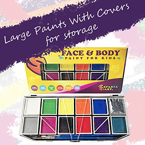 12 COLOR PACK: Sparta Art kid’s face and body paint include 12 ultra bright and easily mixable paints colors. This set includes all your necessary and useful accessories for the ultimate experience: 2 reusable painting brushes for the applying paint and set of stencils for creating good looking and accurate designs.