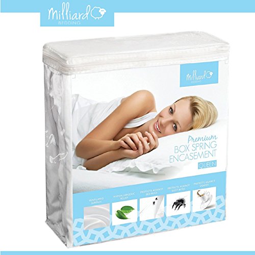 -. Brand : Milliard -. Feature : Encompasses your box spring completely to give you the strongest Bed Bug Protection out there. / Extremely durable seam work for long lasting use. / Stretchable fabric makes installation simple and easy. / Provides relief for allergy and asthma sufferers from dust mites and mold spores. / Machine Washable, Tumble Dry Low Heat. -. Label : Milliard -. Manufacturer : Milliard -. ProductGroup : Home -. ProductTypeName : HOME_BED_AND_BATH -. Publisher : Milliard -. Studio : Milliard -. Title : MILLIARD Premium Hypoallergenic Bed Bug Proof Box Spring Cover/Encasement