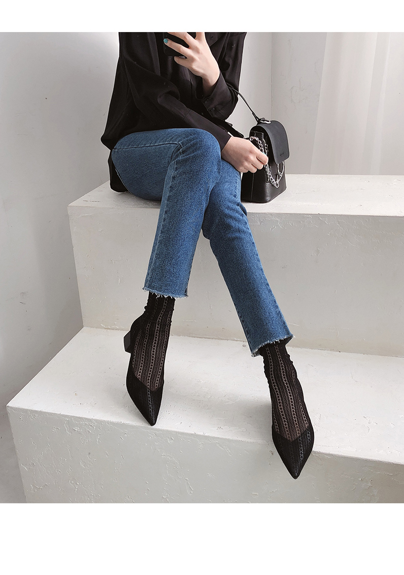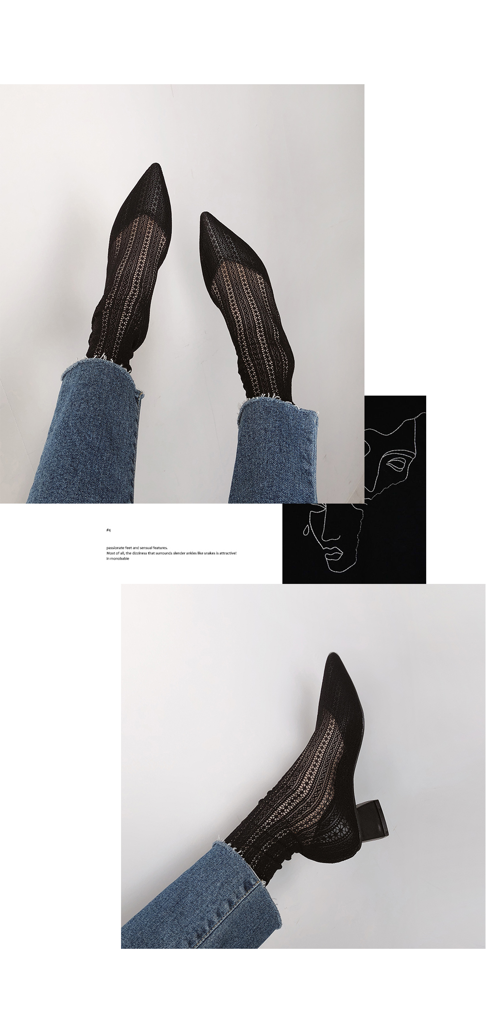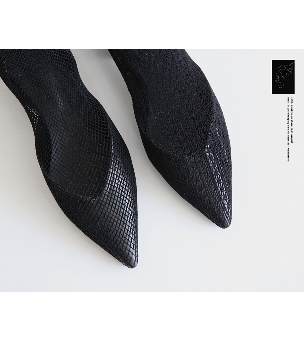 플랫쉐입에 메쉬와 레이스로 랩핑하여 삭스부츠처럼 착화되는 독특한 제품입니다.