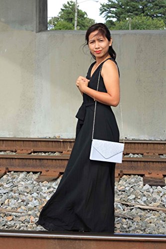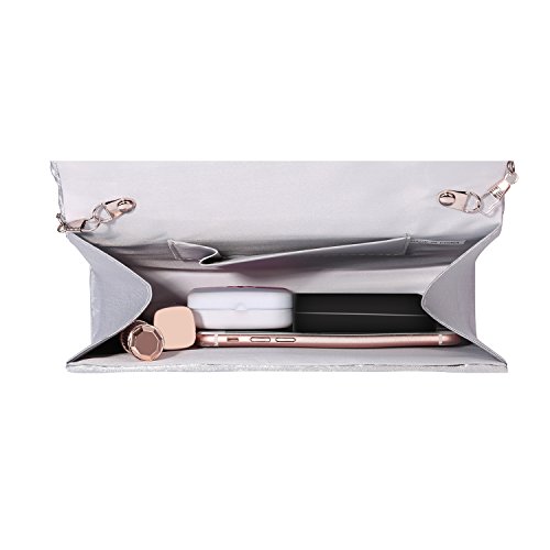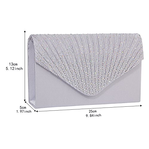 Product Description Gyeitee silver clutch bag is a classic must have for your bag collection. Complement your evening look with this timeless pleated satin and Crystals and rhinestones ornament. With an optional shoulder strap, inner pocket and magnetic snap closure. Team it with a satin evening gown or smart separates for high-end glamour