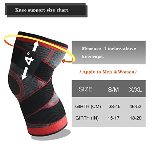- [ Premium Material ]: Our knee brace sleeve is made from elastic and breathable fabric that can keep your knee cool and odor free. It also gives you support while still allowing you to retain your range of motion. Elastic, form fitting and breathable compression fabric maintains joint stability regardless of any activity, while the four way weave construction allows for a full range of motion.