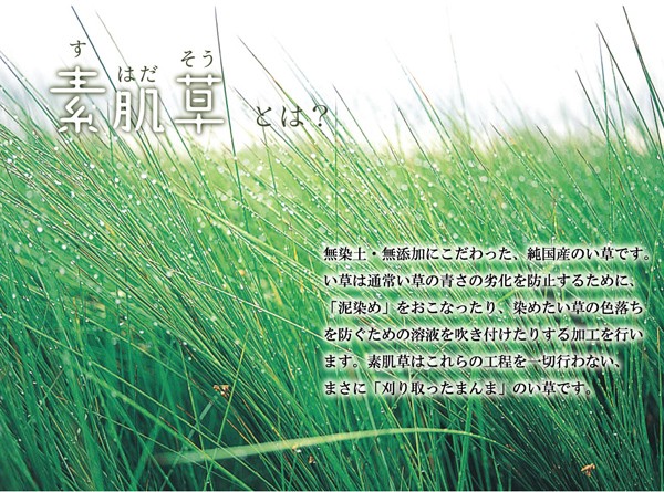 無染土(泥染めをしていない)のイ草を使用したカーペットです。通常、イ草製品の製造工程にイ草の乾燥を速める為やイ草の織機にイ草が通りやすくする為、お客様のお手元に届くまでの日焼け防止などの為に『泥染め』という工程があります。本商品はイ草自体の質の良さ、肌触りにこだわり、泥染めをしておりません。しないことによりスベスベとした、非常に気持ちの良い肌触りを実現しました。泥染めという工程を省くと、乾燥、生地を織るなどの工程も非常に難しくなります。熟練した職人さんしか織れませんし、非常に手間暇のかかる逸品です。国産(九州産)のい草を使用しています。一本一本が太く、表皮が厚く繊維がキメ細かいので弾力性があり、耐久性に優れています。い草には空気の自然浄化作用、湿度の調節作用などがあります。また汚れにくく、使用するうちに黄金色に変化し味が出ます。