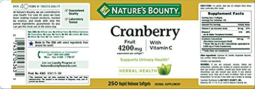 Studio : Nature's Bounty Publisher : Nature's Bounty Binding : Health and Beauty Product Description Cranberry Vit C Softgels Cranberry helps maintain a healthy urinary tract.* Cranberry contains all the active ingredients of cranberry juice without added sugars often used to mask the tart flavor. Our unique Triple Strength Cranberry Concentrate contains the equivalent of 25,200 mg per serving of fresh Cranberry fruit**, so two softgels daily are all you need! Cranberries are known for their ability to help maintain a healthy urinary tract.* This product also contains Vitamin C to support antioxidant and immune health, plus Vitamin E, an essential nutrient crucial for good health.* Other Ingredients: Soybean Oil, Gelatin, Vegetable Glycerin. Contains <2% of: Soy Lecithin, White Beeswax. Contains soy ingredients. WARNING: If you are pregnant, nursing, taking any medications, planning any medical procedure or have any medical condition, consult your doctor before use. Discontinue use and consult your doctor if any adverse reactions occur. Keep out of reach of children. Store at room temperature. Do not use if seal under cap is broken or missing. ‡Based on Nielsen data Total FDMX 52 weeks ending 09.26.15 No Artificial Color, Flavor or Sweetener, No Preservatives, No Sugar, No Starch, No Milk, No Lactose, No Gluten, No Wheat, No Yeast, No Fish. Sodium Free. 0